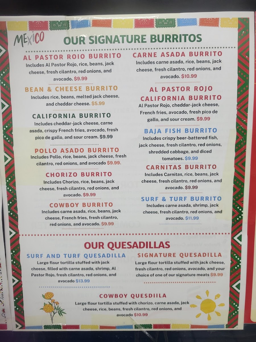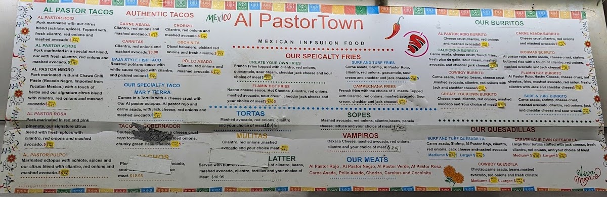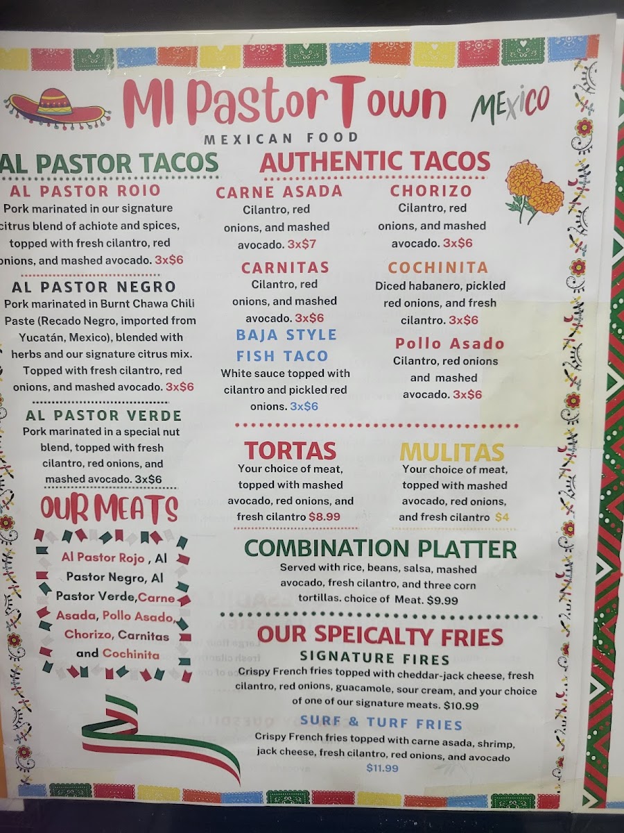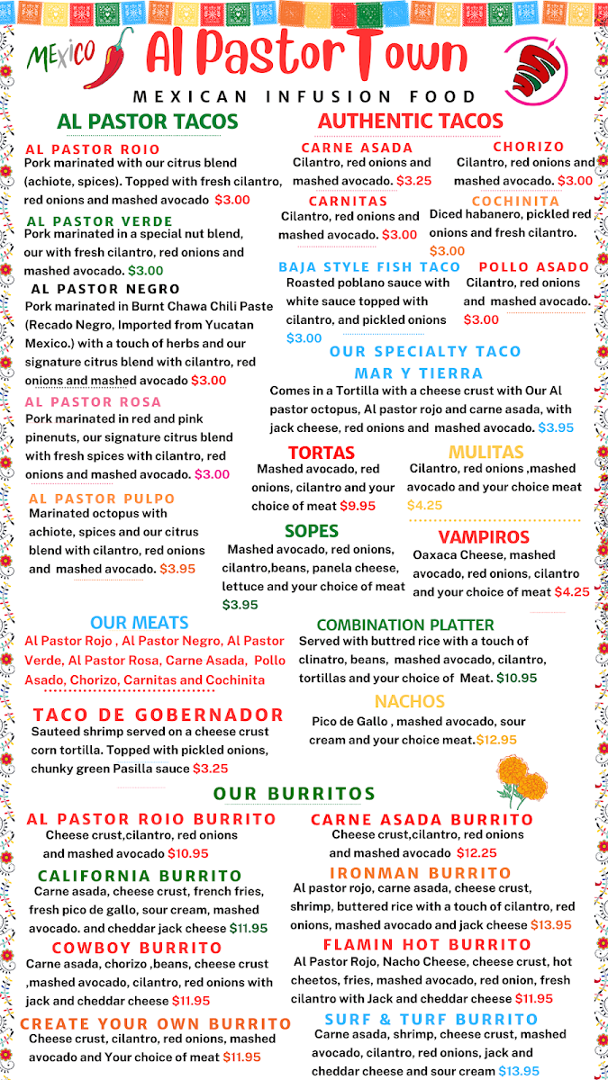 The menu at Mi Pastor Town offers a vibrant and diverse selection of Mexican-inspired dishes, showcasing both traditional flavors and creative twists. For taco lovers, the Al Pastor Tacos featuring Al Pastor Rojo stand out, while the Authentic Tacos menu includes a variety of options like Baja Style Fish Taco, Carnitas, Chorizo, Carne Asada, and Pollo Asado. For those seeking something unique, the Mar Y Tierra specialty taco is a must-try. The Mini Menu is perfect for those looking to sample different flavors, offering items like Mini Mulitas, Mini Asada Tacos, and Mini Chicken Tacos, among others. Burrito enthusiasts will enjoy options such as the Al Pastor Rojo Burrito, Surf & Turf Burrito, and California Burrito, while the Monje Crazy Burrito adds an adventurous twist. The Specialty Fries menu features indulgent creations like Campechana Fries and Surf And Turf Fries, perfect for a savory side. You can also enjoy Vampiros or a Cowboy Quesadilla for a tasty, cheesy experience. The Tortas menu includes crowd favorites like the Cowboy Torta and Surf And Turf Torta. If you're in the mood for something different, the Classic Burgers (including the Bacon & Cheese Burger) or wings in different sizes such as the 5 Piece Bite or the 20 Piece Heavy Hitter offer hearty options. Whether you’re craving tacos, burritos, fries, or a burger, Mi Pastor Town provides something for everyone with a fun mix of flavors and satisfying portions.