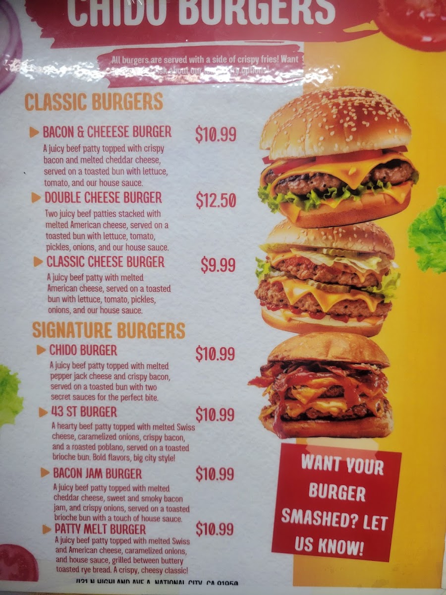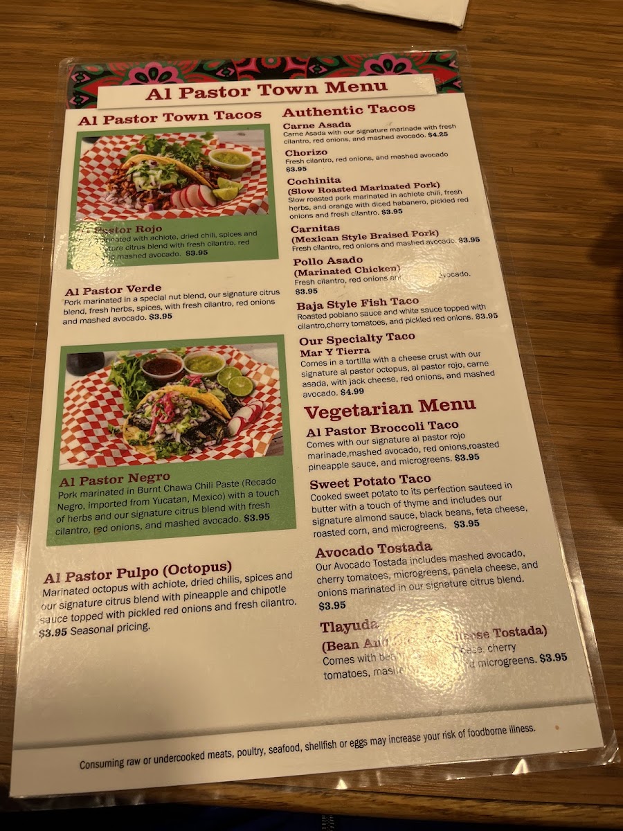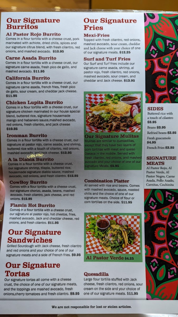 The menu at Mi Pastor Town offers a vibrant and diverse selection of Mexican-inspired dishes, showcasing both traditional flavors and creative twists. For taco lovers, the Al Pastor Tacos featuring Al Pastor Rojo stand out, while the Authentic Tacos menu includes a variety of options like Baja Style Fish Taco, Carnitas, Chorizo, Carne Asada, and Pollo Asado. For those seeking something unique, the Mar Y Tierra specialty taco is a must-try. The Mini Menu is perfect for those looking to sample different flavors, offering items like Mini Mulitas, Mini Asada Tacos, and Mini Chicken Tacos, among others. Burrito enthusiasts will enjoy options such as the Al Pastor Rojo Burrito, Surf & Turf Burrito, and California Burrito, while the Monje Crazy Burrito adds an adventurous twist. The Specialty Fries menu features indulgent creations like Campechana Fries and Surf And Turf Fries, perfect for a savory side. You can also enjoy Vampiros or a Cowboy Quesadilla for a tasty, cheesy experience. The Tortas menu includes crowd favorites like the Cowboy Torta and Surf And Turf Torta. If you're in the mood for something different, the Classic Burgers (including the Bacon & Cheese Burger) or wings in different sizes such as the 5 Piece Bite or the 20 Piece Heavy Hitter offer hearty options. Whether you’re craving tacos, burritos, fries, or a burger, Mi Pastor Town provides something for everyone with a fun mix of flavors and satisfying portions.
