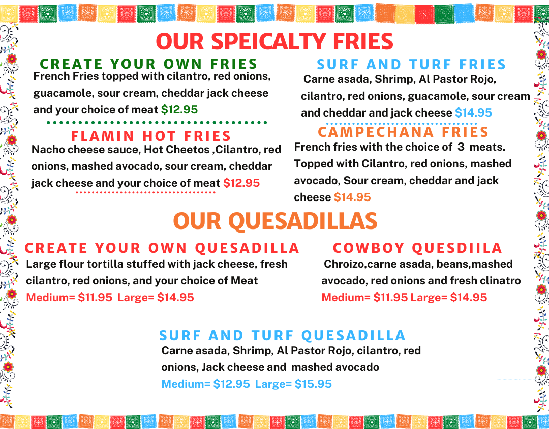 Contains carne asada, shrimp, al pastor rojo, topped with jack cheese, avocado, red onions and cilantro.